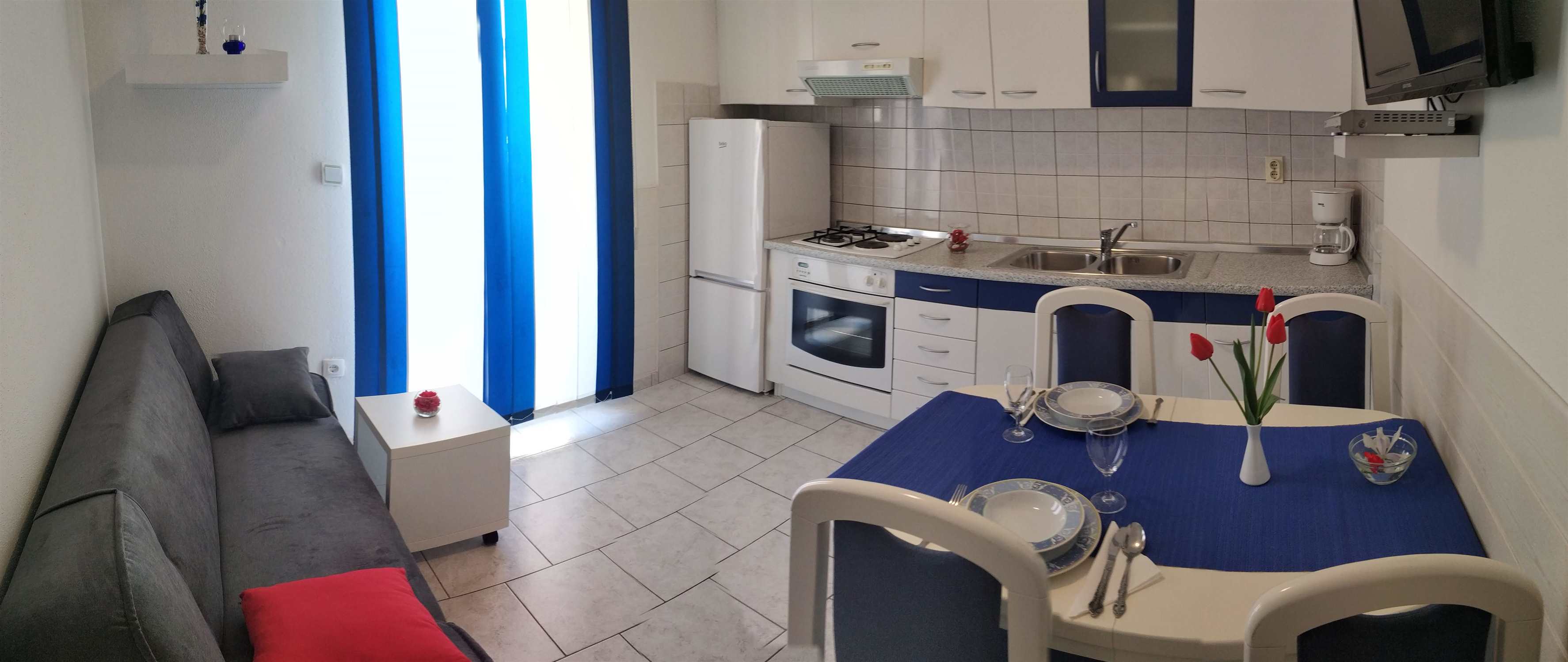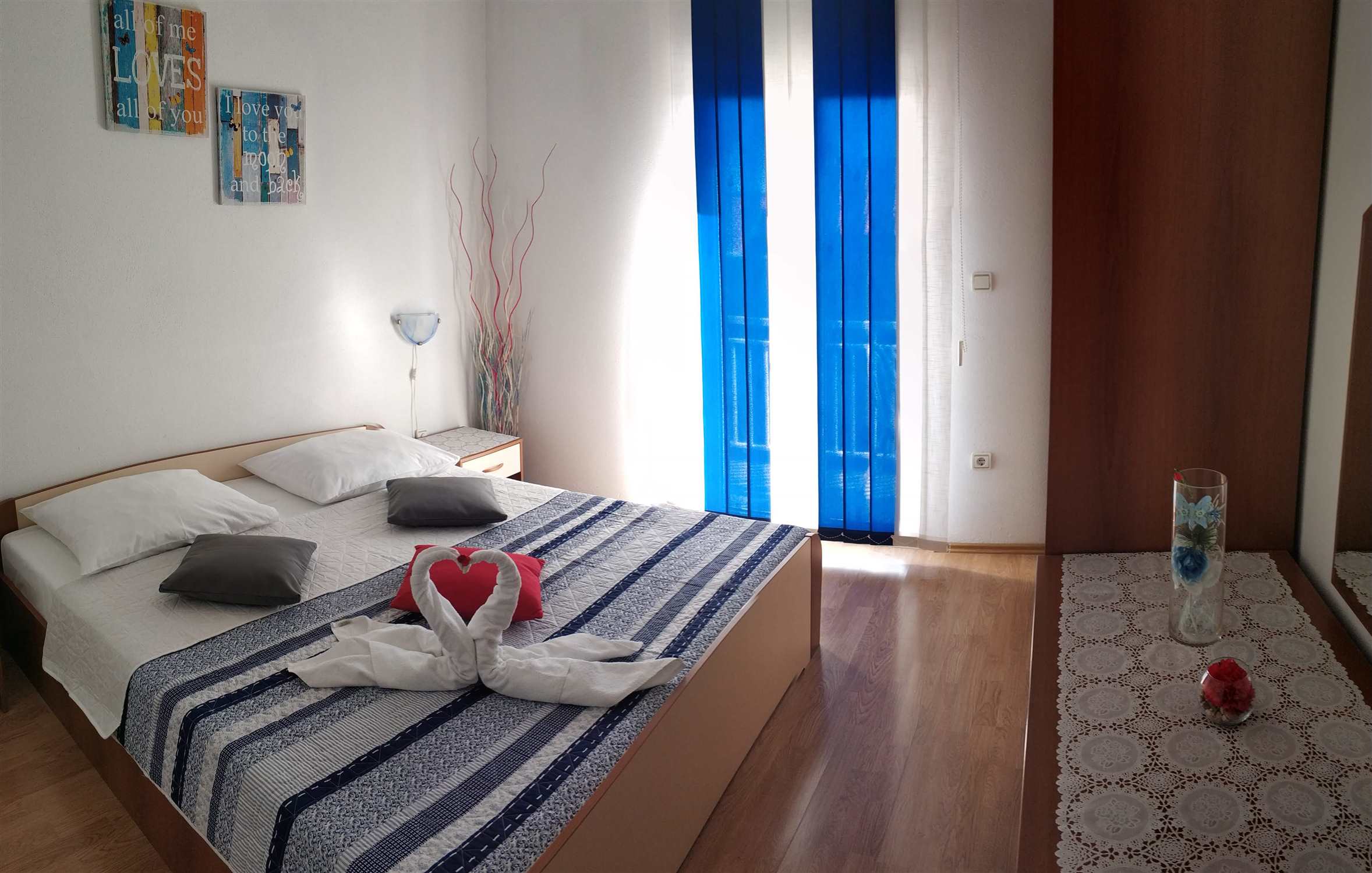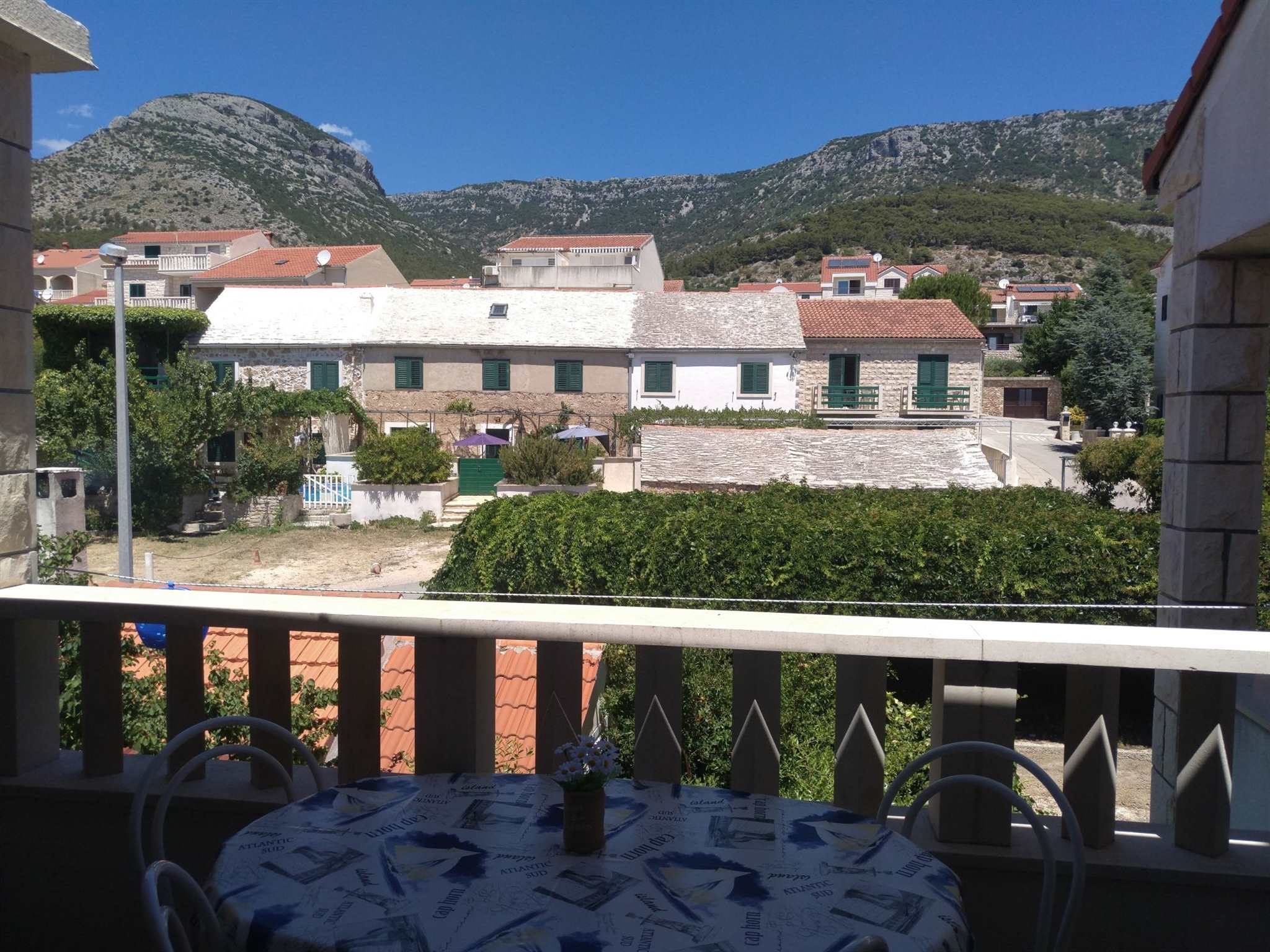 The apartment is located on the second floor of our house in Bol on the island of Brač. The size is 55 m2 and has a terrace of 7 m2 overlooking the hill surrounding Bol, a balcony of 3 m2 overlooking the sea and the island of Hvar. The apartment consists of two rooms, one with a double bed and one with 2 single beds (beds can be connected), kitchen with living room, bathroom and toilet and spacious lobby.